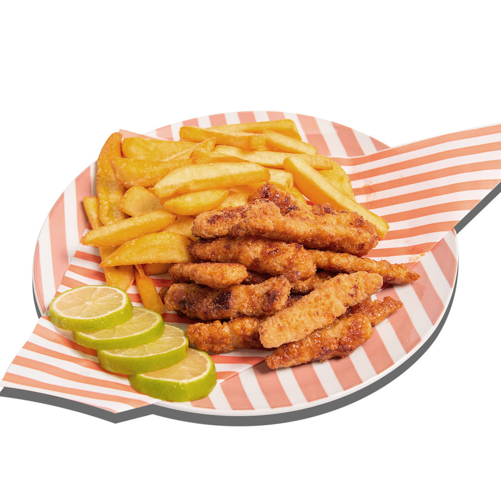 Crispy breaded chicken breast strips served with freshly made golden chips. A tasty classic that always hits the spot.